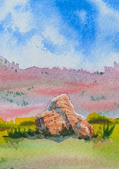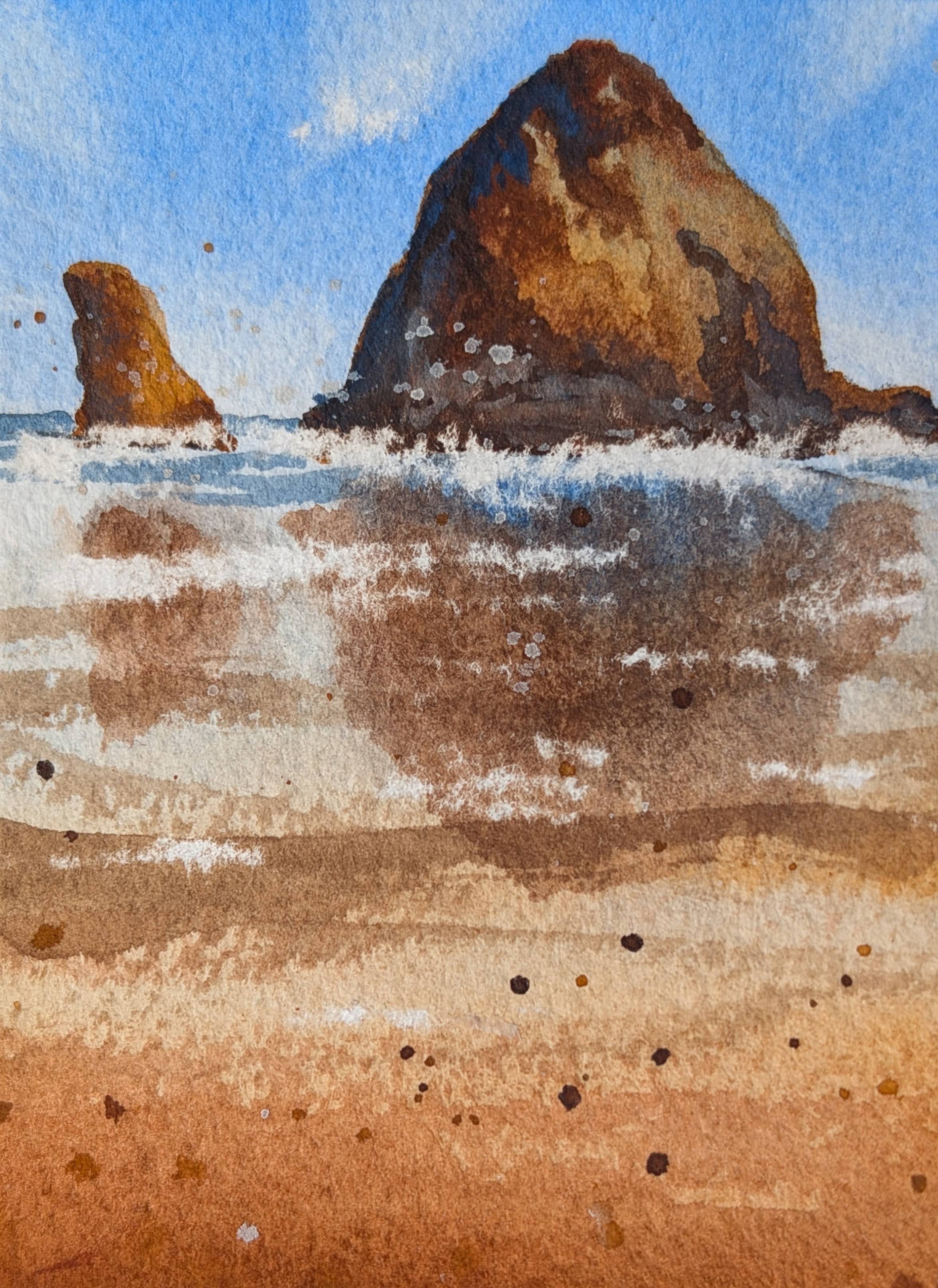 The purple underpainting came through the finished painting with surprising glimmers of peach. I was delighted to see the warmth sparkle through! So delighted, in fact, that I tried a similar composition of the same rock from a different vantage point.