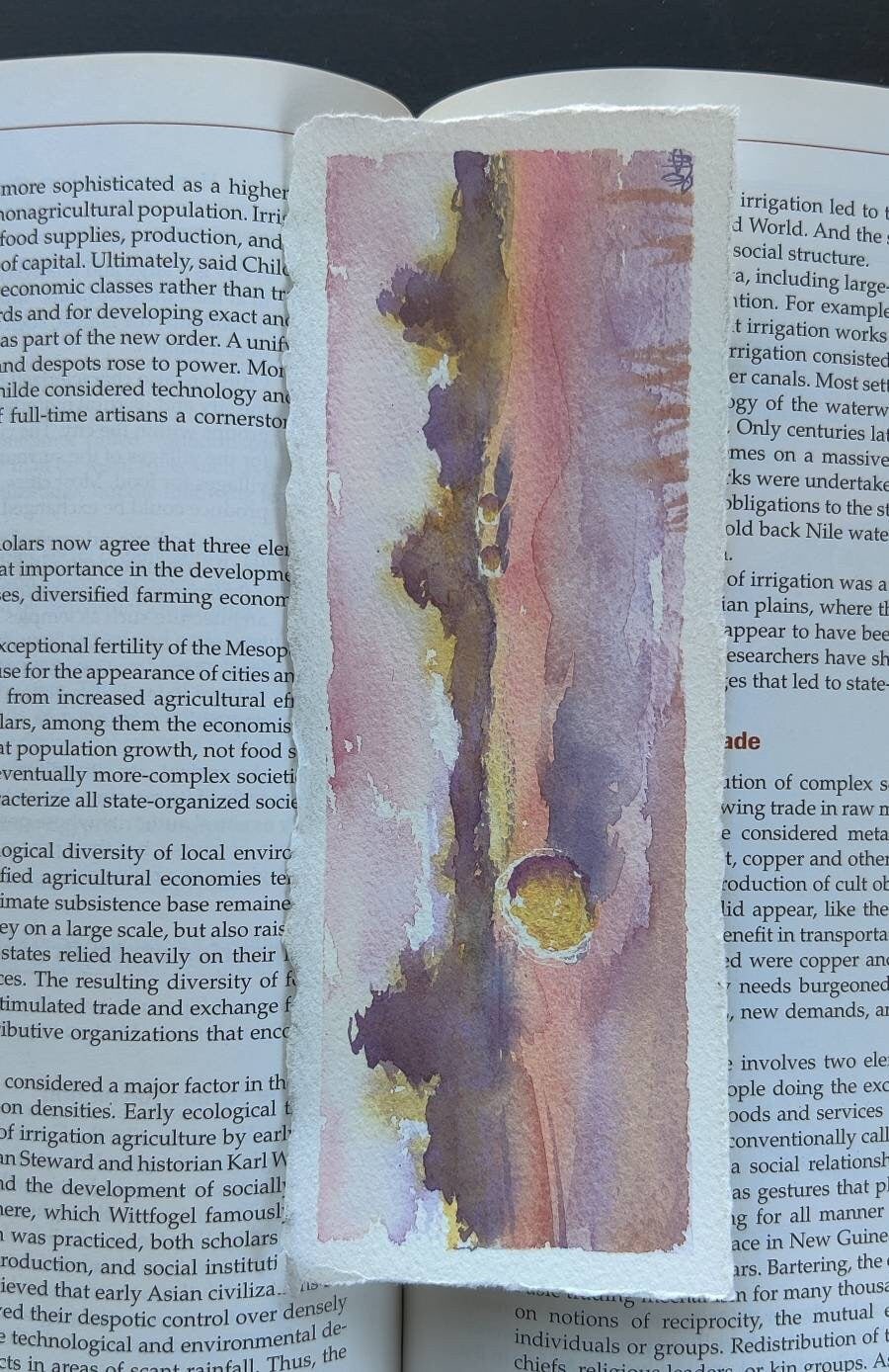 Pinks and purples light the winter sky and color the grasses around bales of hay. The sun rises slowly in the distance, casting lavender shadows. Painted on hand-torn 140lb cold press paper, inspired by a road trip around Colorado.