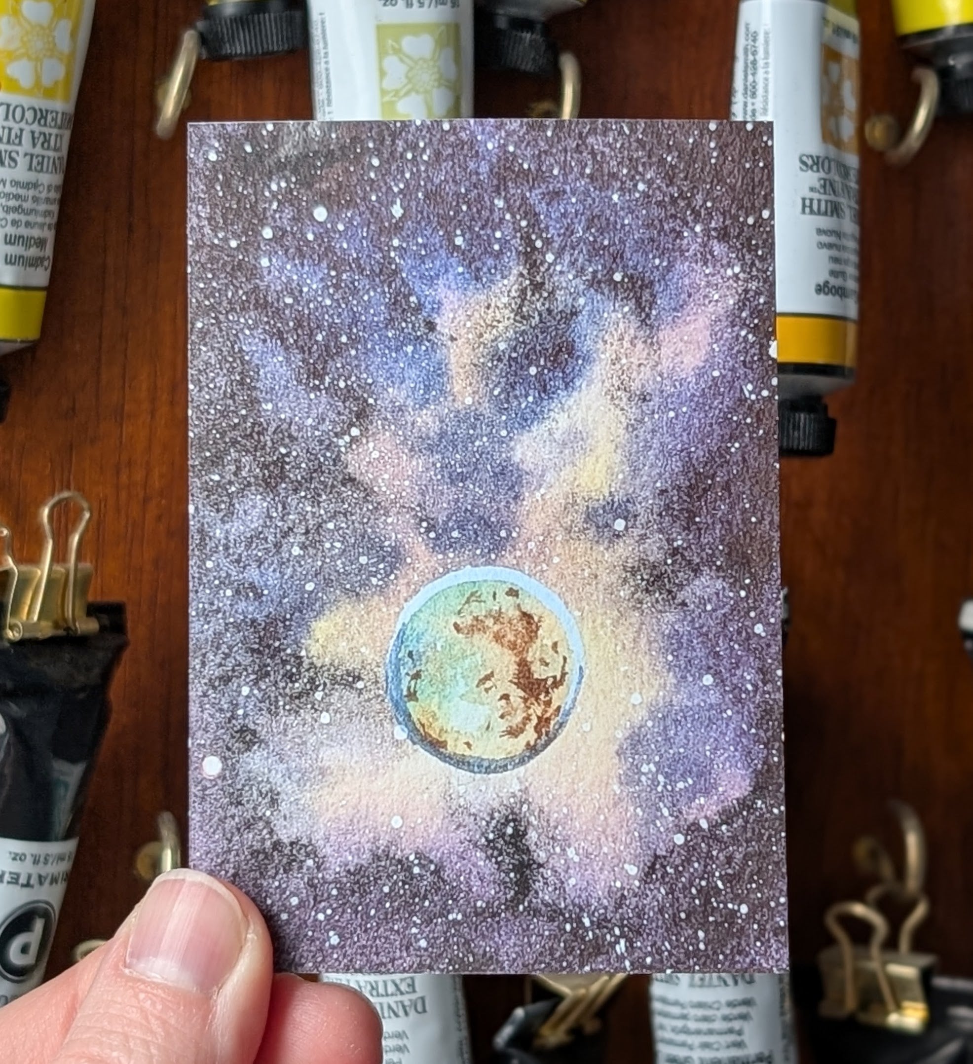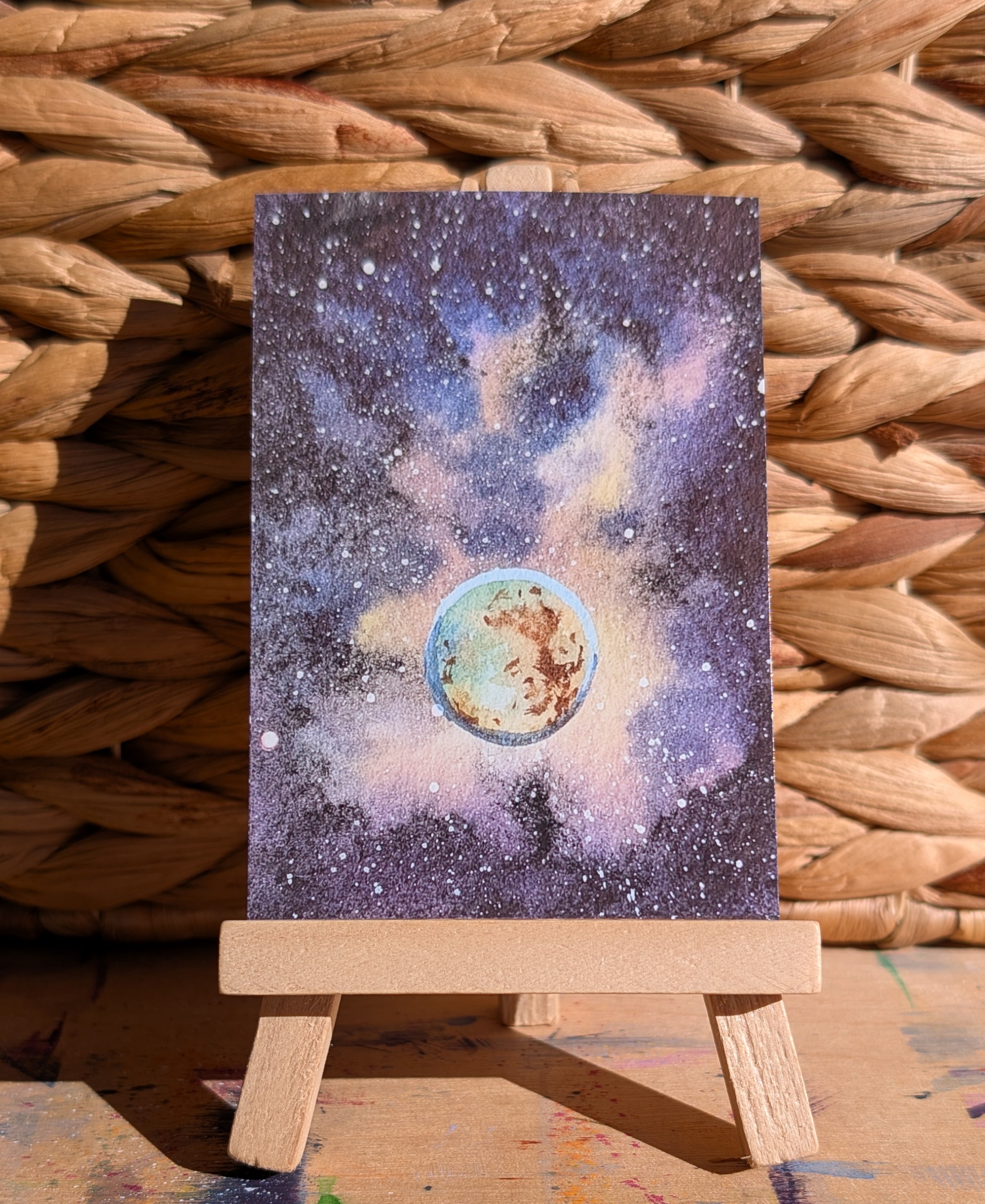 Have you ever wanted your very own world? With a simple click of the bid button, this planet can be yours! I had a great time creating this entire universe using only watercolors, and I think you'll enjoy adding this gem to your collection.