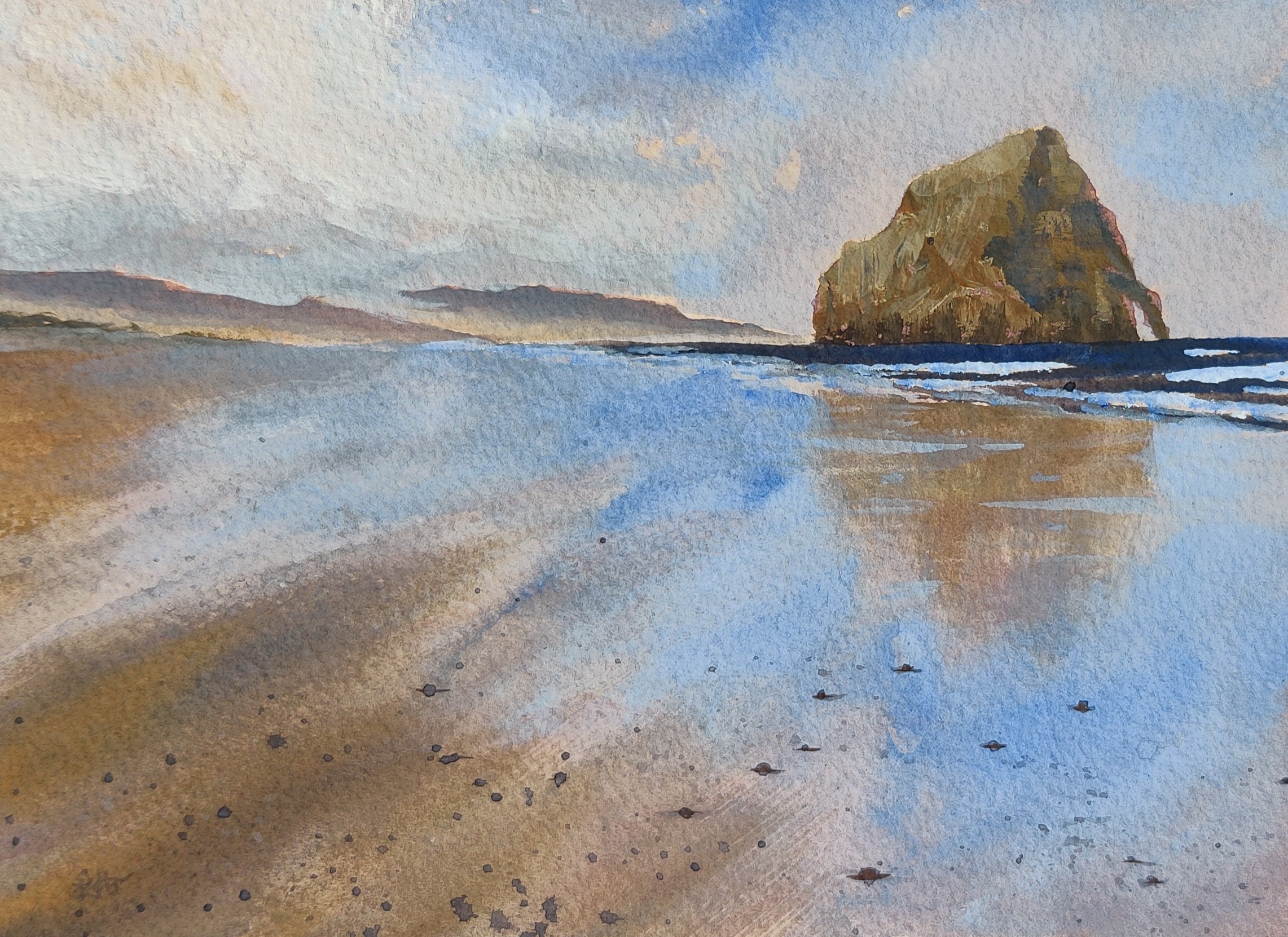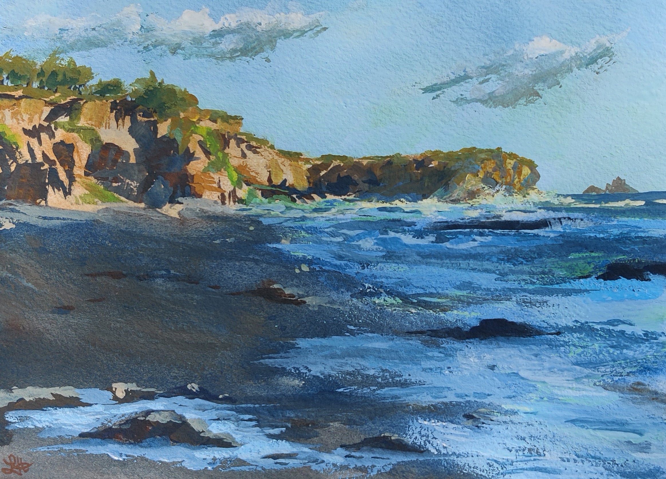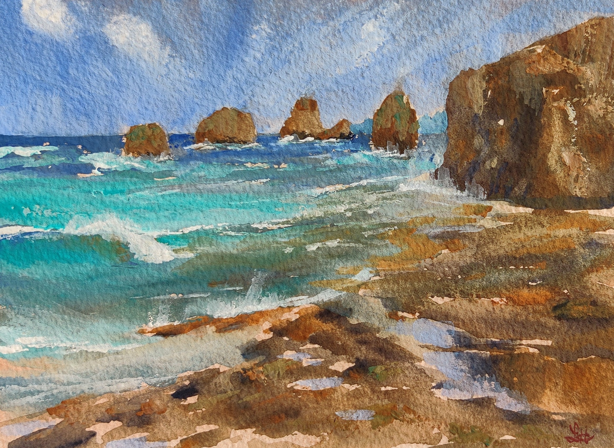 Rocky outcrops tumble down to be swallowed up by the sea. Clashing waves reach up to touch the sunset haze in the moody Pacific Northwest.