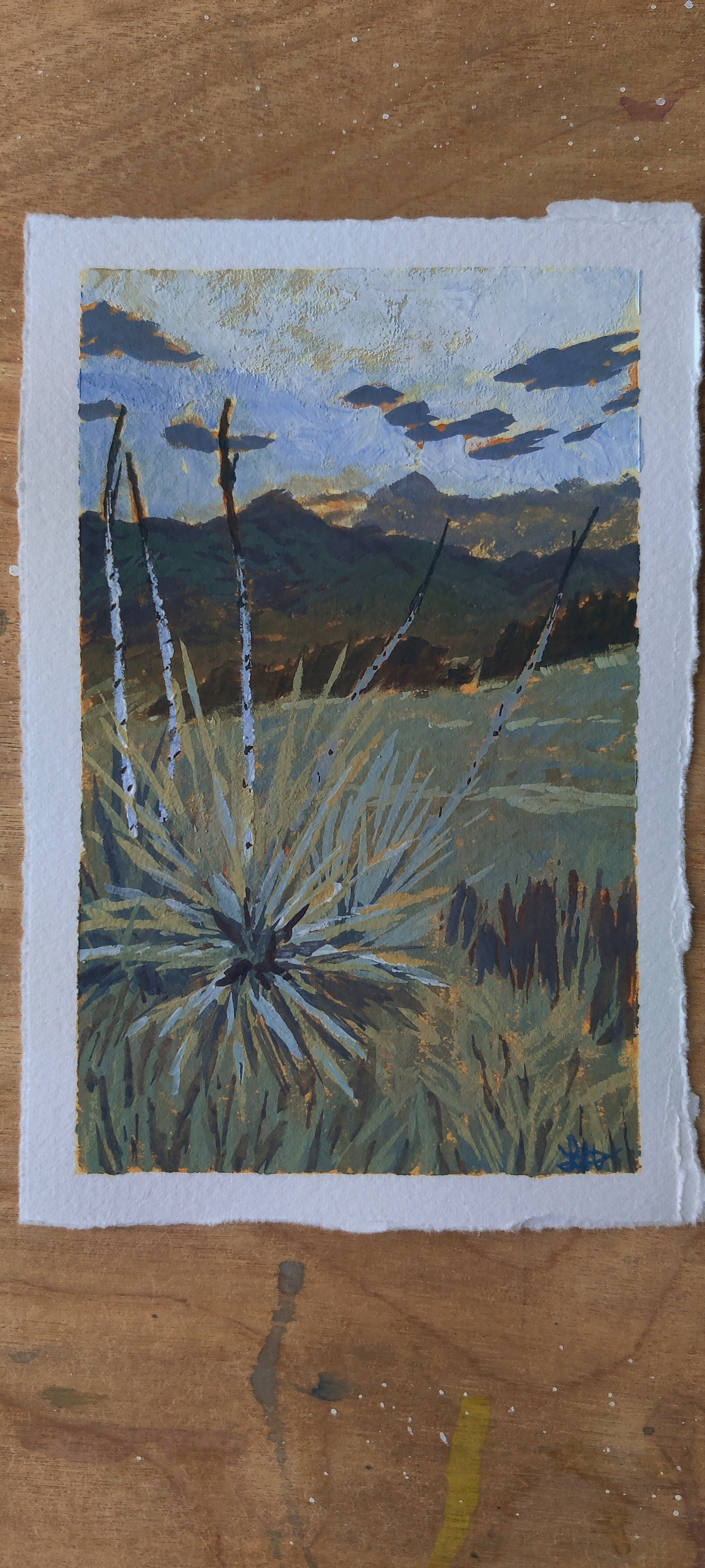 Last rays of the sun creep over the mountains and peek out front m behind evening clouds. Yucca stands in shadow.