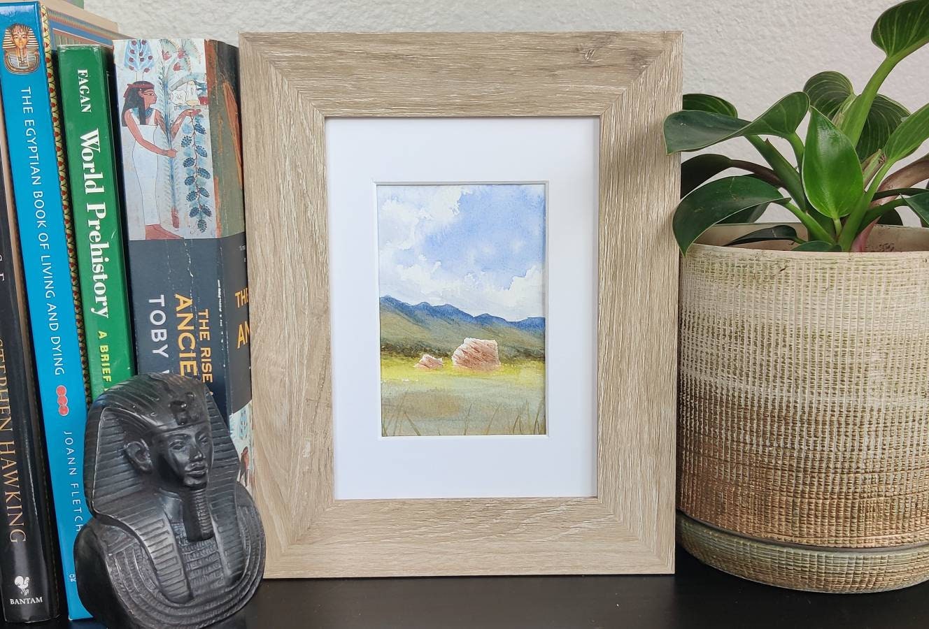 Clouds hang over the emerald cascades of the distance mountains, parting to illuminate a statue carved by time. Sun shafts race over the field, casting a spotlight with golden rays. Inspired by an afternoon summer hike near Red Rocks.