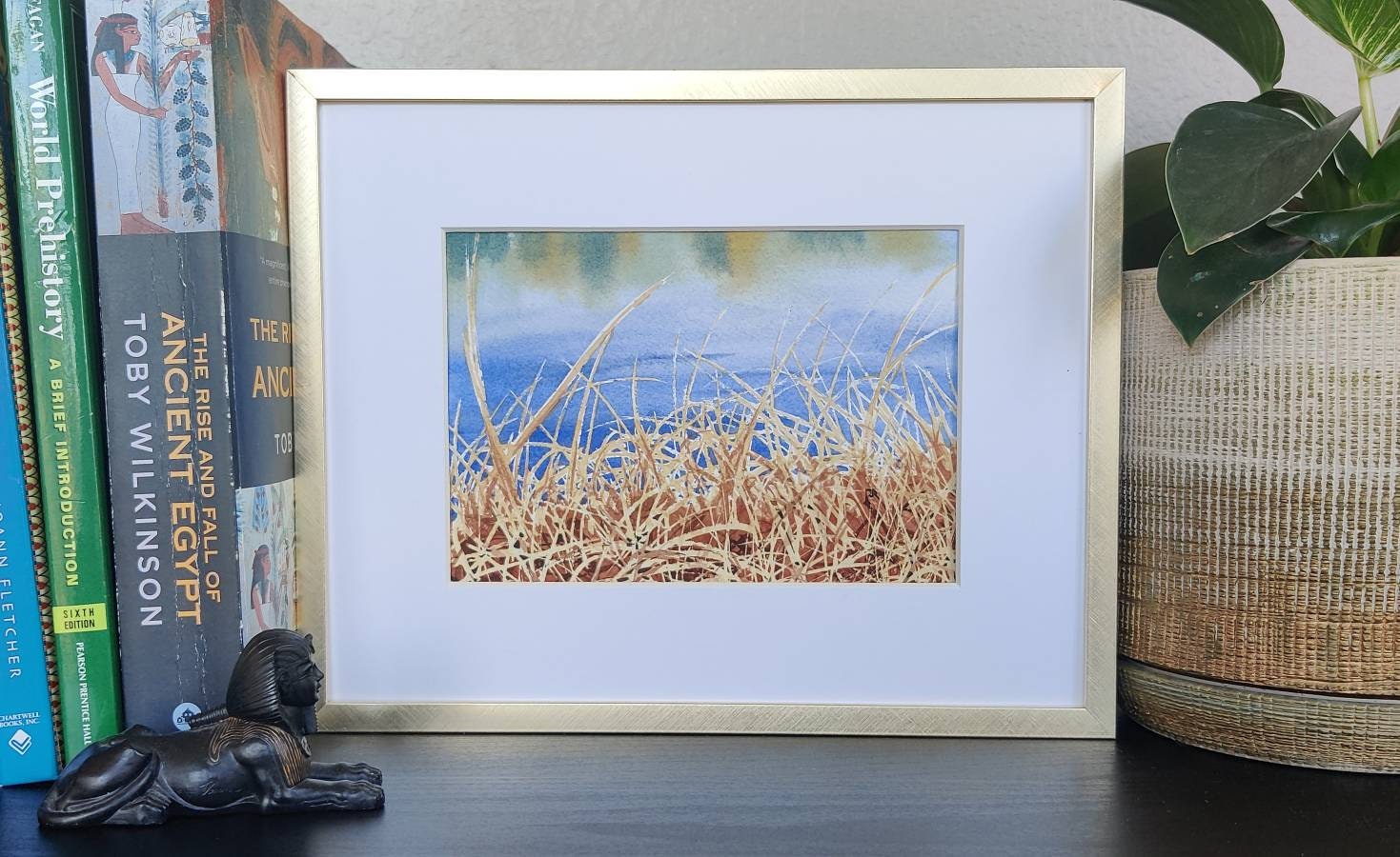 Mirages of trees reflect in the lake above the Marsh Grasses. Blades of ochre and amber weave natural hollows and hideaways on the shore. Inspired by a walk along a Colorado lake.