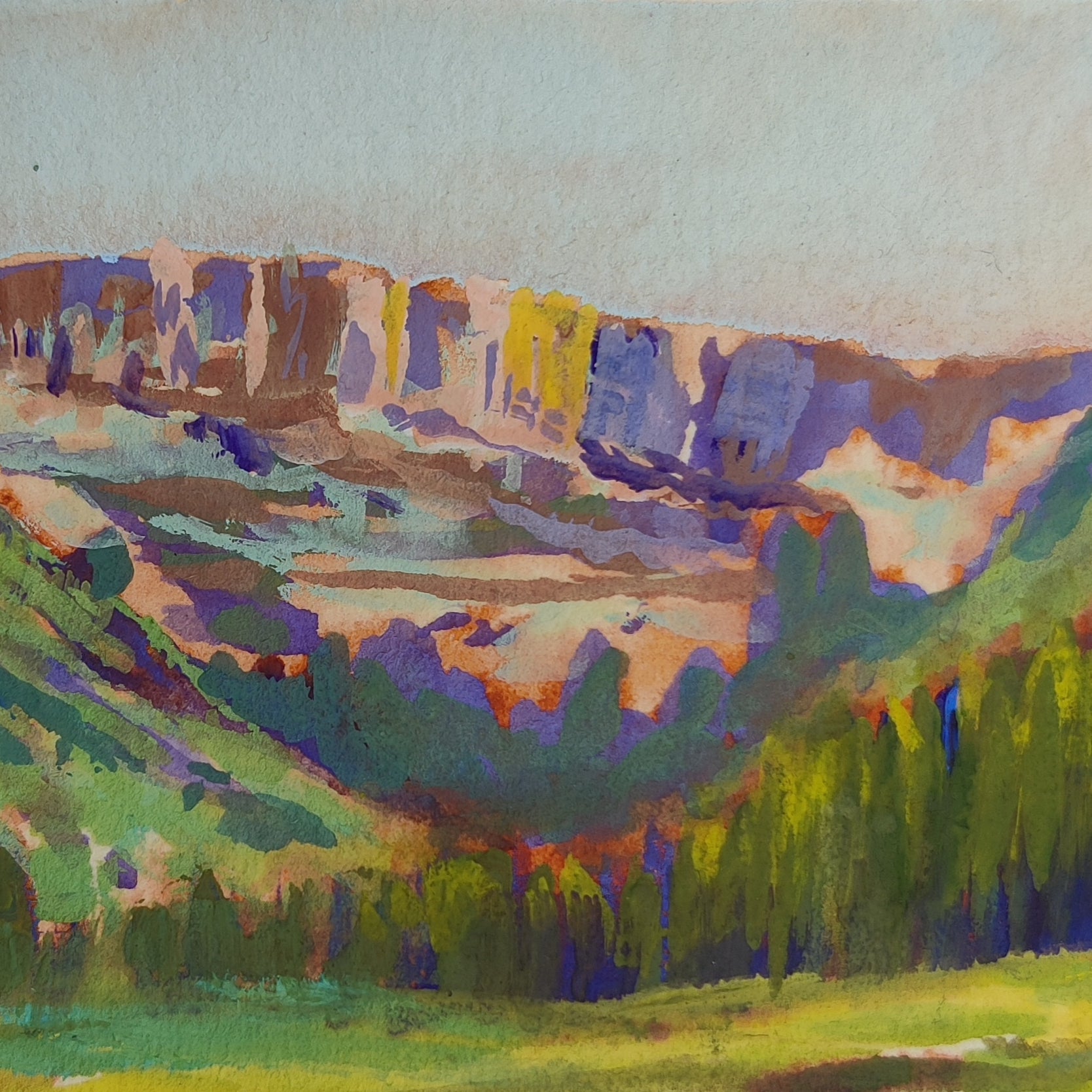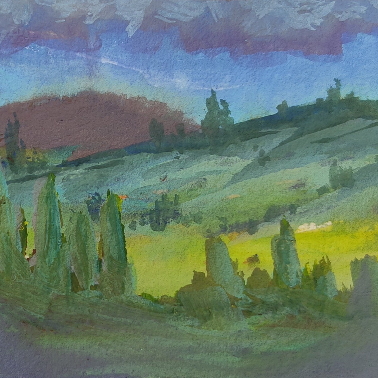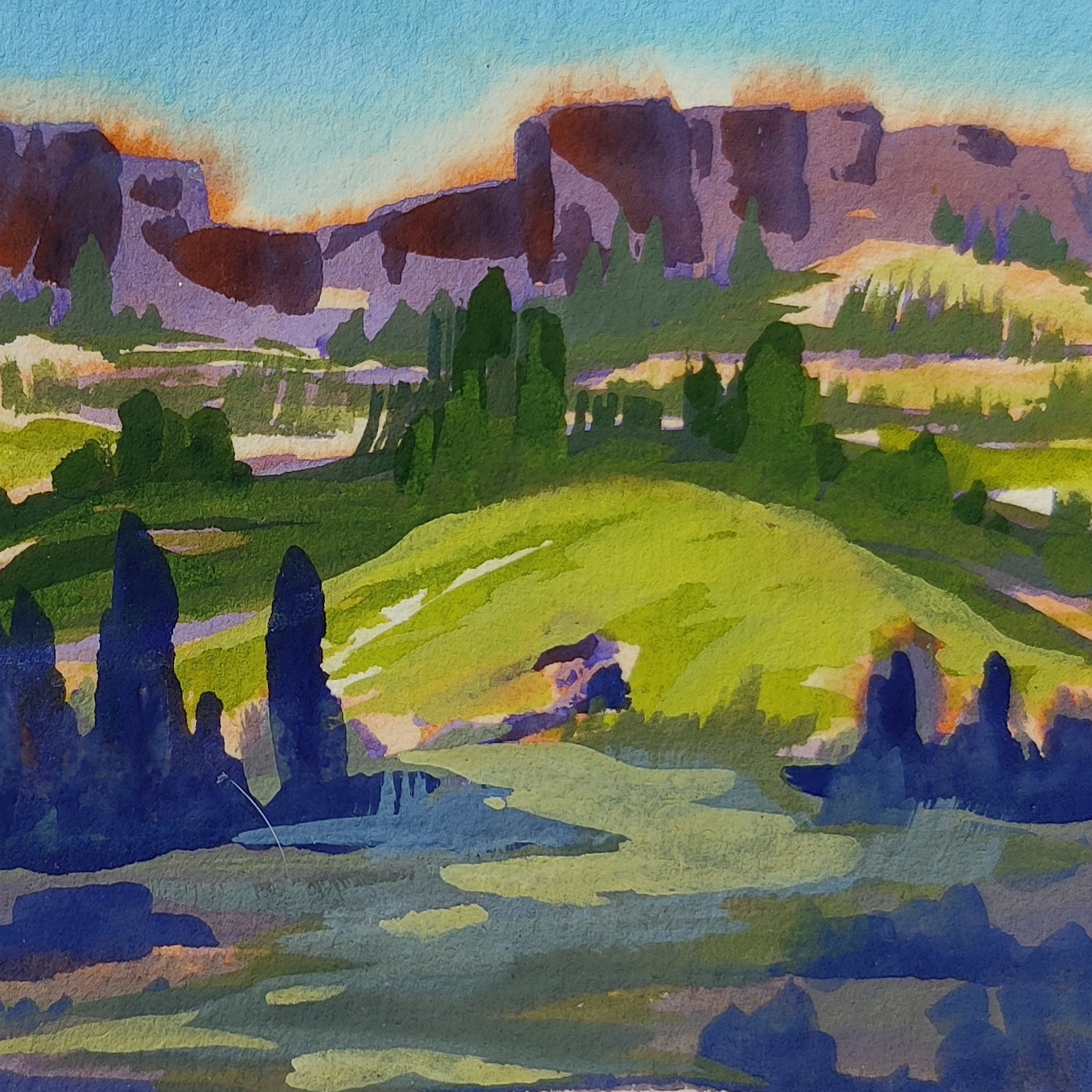 Next, I wanted to try to create a more muted version of this scene. I could really feel the temperature drop when I stood in the shadows at sunset, so I wanted to try and capture that feeling in my next painting.