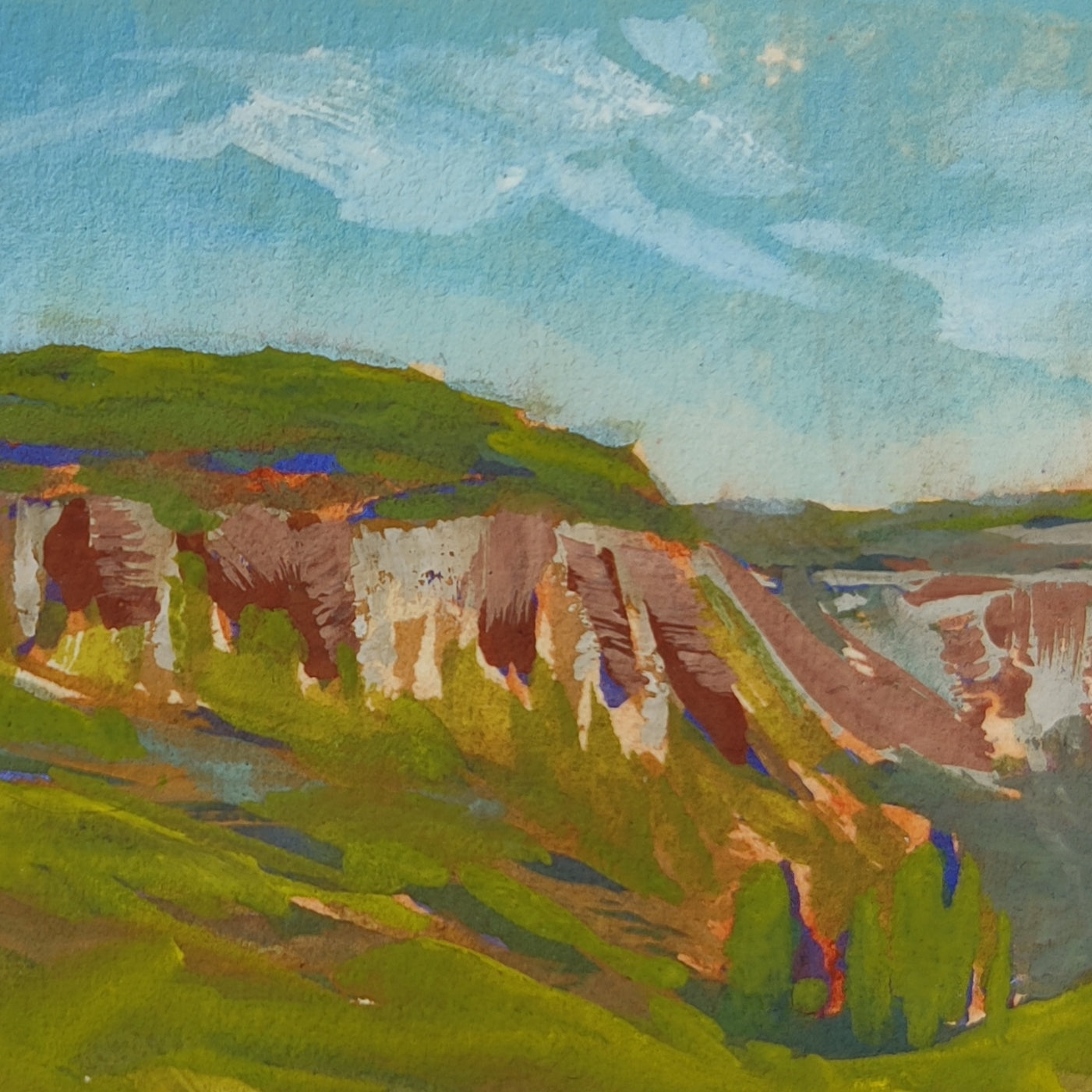 The purple underpainting came through the finished painting with surprising glimmers of peach. I was delighted to see the warmth sparkle through! So delighted, in fact, that I tried a similar composition of the same rock from a different vantage point.