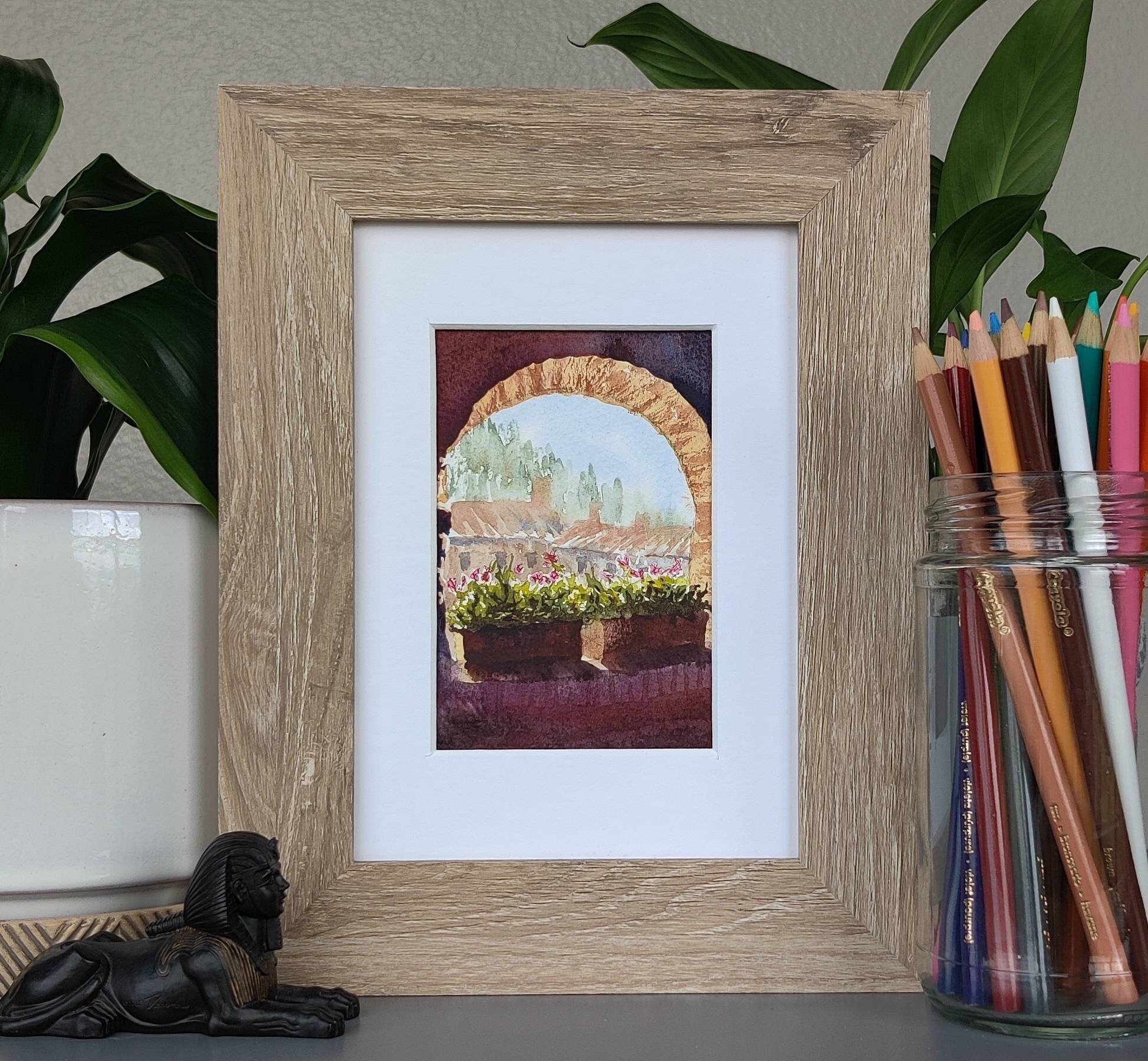 Sun shines through the castle window, sparkling off the spring blooms of the flower box. Painted on hand-torn 140lb cold press paper, inspired by an evening spent at a gorgeous castle.